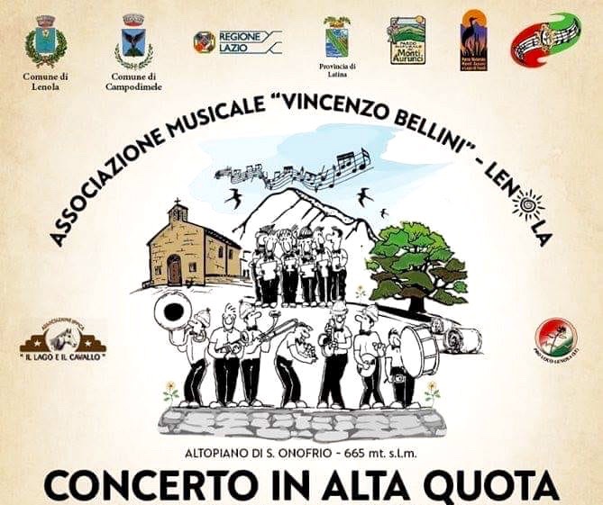 Concerto in Alta Quota. L'evento, rinviato domenica 2 giugno a causa del maltempo, ci sarà domenica 9 giugno a Campodimele, in località Altopiano di Sant'Onofrio a 665 metri sul livello del mare. Organizzato dall'associazione Musicale "Vincenzo Bellini" di Lenola e patrocinata dal Parco dei Monti Aurunci.