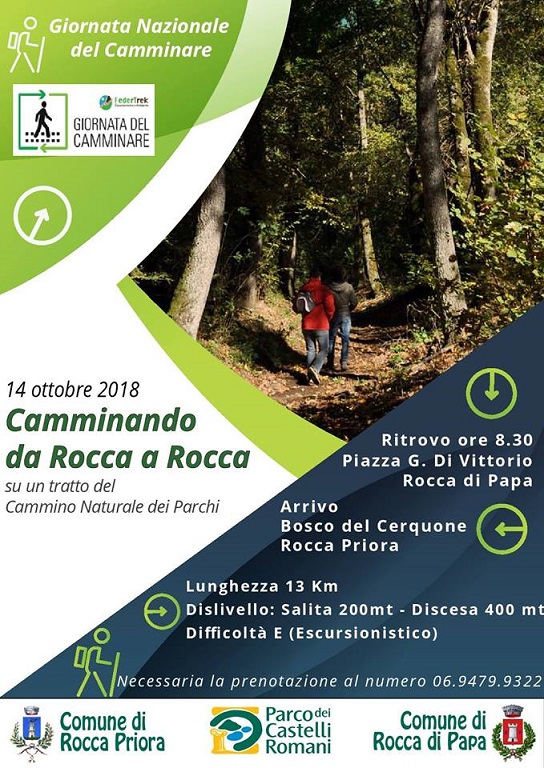 In occasione della "Giornata nazionale del Camminare" promossa da FederTrek, il Parco dei Castelli Romani, insieme agli Assessorati alle Politiche Ambientali di Rocca di Papa e di Rocca Priora, organizza una camminata sui sentieri che uniscono i due Comuni.