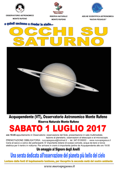 L’appuntamento è alle ore 19,45 direttamente in Osservatorio: per arrivare in orario è consigliato mettersi in viaggio dal centro abitato di Acquapendente alle ore 19,00 circa. La serata inizierà con l'osservazione del Sole al telescopio, seguirà un viaggio nel Sistema Solare in scala con presentazione in sala multimediale, quindi lezione al planetario ed infine osservazioni notturne al telescopio ed al microscopio. E' importante dotarsi di scarpe comode, acqua da bere, cena al sacco e torcia elettrica per il rientro in notturna.
