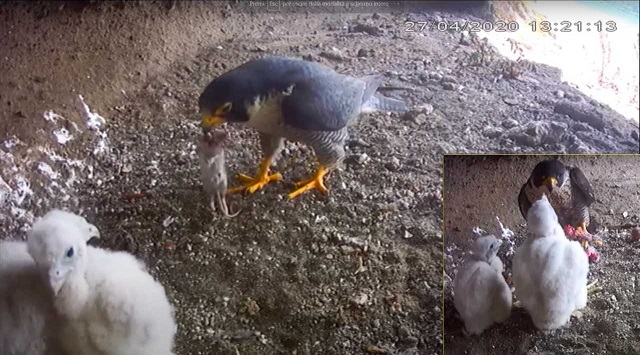 La diretta è partita con l’osservazione della cova delle quattro uova deposte tra il 5 e l’8 marzo. La schiusa è avvenuta per il primo uovo il 9 aprile. A seguire il 10, è stata la volta del secondo, e tutti con il fiato sospeso abbiamo atteso la sorte del terzo e quarto uovo. Il terzo pullo è nato l’11 aprile, ma a distanza di pochi giorni è morto, mentre il quarto uovo si è rivelato infecondo. Per alcuni giorni il pensiero principale della coppia di Falchi è stato quello di accudire e nutrire i nuovi nati, abbiamo visto come la femmina, molto premurosa in condizioni meteo avverse, provvedeva a riparare con il proprio corpo i piccoli mentre il maschio procurava il cibo; l’abbiamo poi vista in una scena molto toccante disfarsi del corpicino del piccolo morto dopo circa cinque giorni. Abbiamo assistito giorno dopo giorno alla crescita dei due pulli, osservando alcune peculiarità e differenze tra maschi e femmine dal vivo, occasione davvero rara visti i siti impervi e lontani dall’accesso umano che i Falchi scelgono per nidificare, fino alle prime perlustrazioni del nido, alla comparsa del piumaggio più scuro ed infine ai primi tentativi di spiccare il volo culminati con l’involo del 25 maggio.