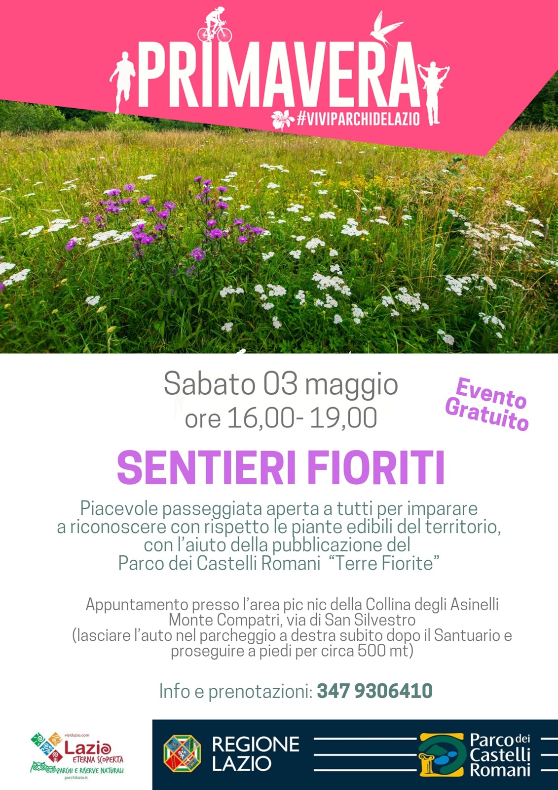Torna a grande richiesta, sabato 3 maggio dalle ore 16.00 alle ore 19.00, l’evento gratuito “Sentieri fioriti”, una passeggiata alla ricerca delle erbe e fiori edibili del nostro territorio, con l’ausilio della pubblicazione del Parco dei Castelli Romani “Terre Fiorite”.