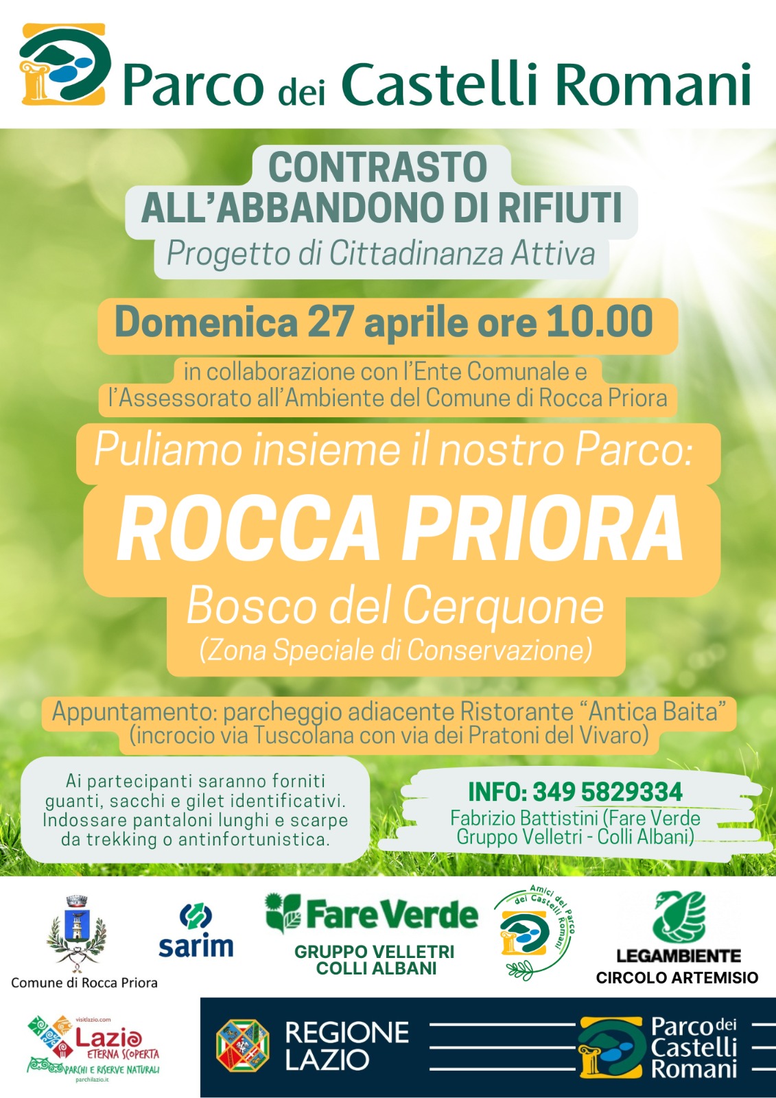 Le associazioni capofila del progetto, “Fare Verde Velletri - Colli Albani” e “Legambiente Circolo Artemisio”, insieme alle “Associazioni Amiche del Parco”, provvederanno alla rimozione dei rifiuti dalla zona del bosco del Cerquone nel territorio di Rocca Priora (RM). L’appuntamento è alle ore 10.00, al parcheggio adiacente il ristorante “Antica Baita” – incrocio via Tuscolana con via Pratoni del Vivaro.