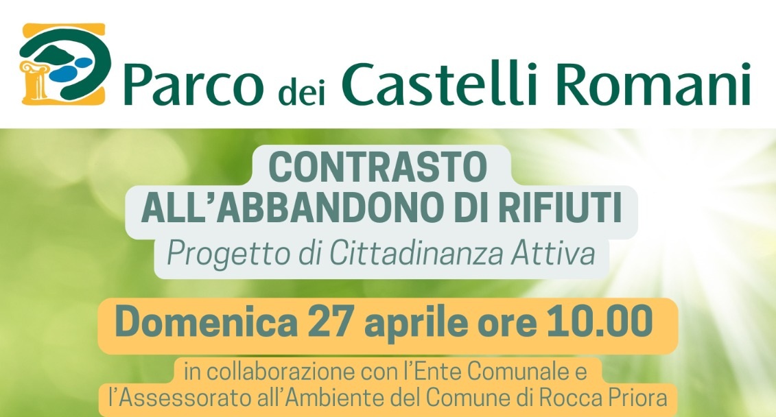 Domenica 27 aprile, si recupera l’appuntamento rinviato lo scorso 13 aprile con il progetto di Cittadinanza Attiva “Contrasto all’abbandono di rifiuti”, promosso dal Parco dei Castelli Romani, in collaborazione con l’Amministrazione comunale e l’Assessorato all’Ambiente del Comune di Rocca Priora (RM).