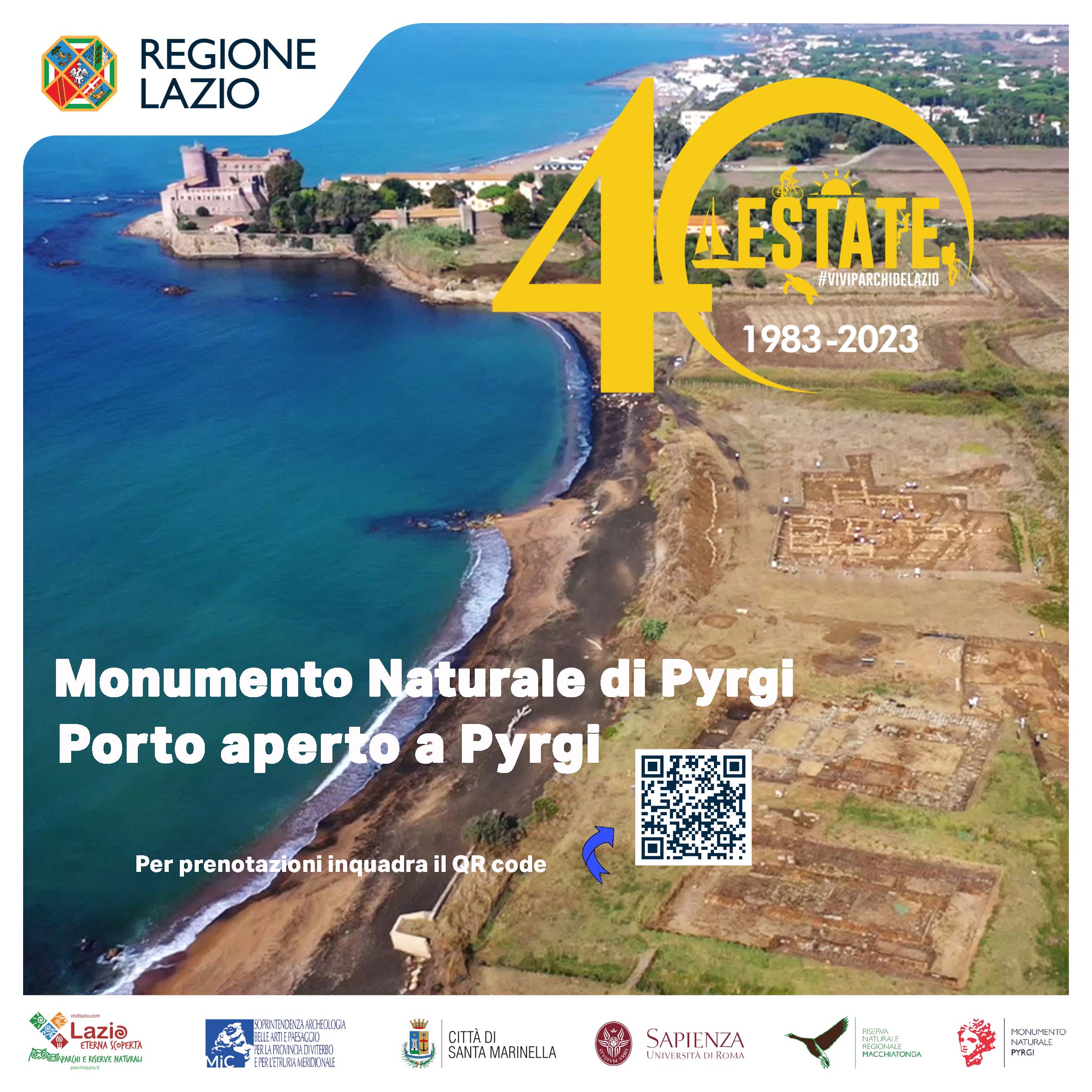 In occasione del 40 esimo anniversario dell'istituzione della Riserva Naturale di Macchiatonda, sabato 02 e domenica 03 settembre 2023 aperture straordinarie del sito archeologico di Pyrgi. Accompagnati dagli archeologi che ogni mese di settembre operano sul campo, sarà possibile scoprire il grande complesso sacro dedicato alle dee Uni e Thesan, con i due grandi templi A e B, e i resti dell'antico abitato etrusco che si affacciava direttamente sul mare. In collaborazione con la Sovraintendenza archeologica Belle Arti e Paesaggio Etruria meridionale.