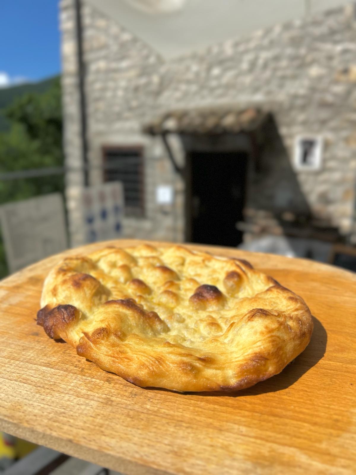 La pizza bianca vanta una lunga tradizione, risale al tempo in cui il pane si faceva in casa, infatti, si ricava dallo stesso impasto. Prima di infornare il pane, quando le pareti del forno erano ben calde, si toglieva la brace e si infornavano le pizze direttamente sul piano del forno dopo averlo ripulito. Sul fondo della preparazione rimanevano tracce di brace e cenere, segno della sua estrema semplicità e rusticità.