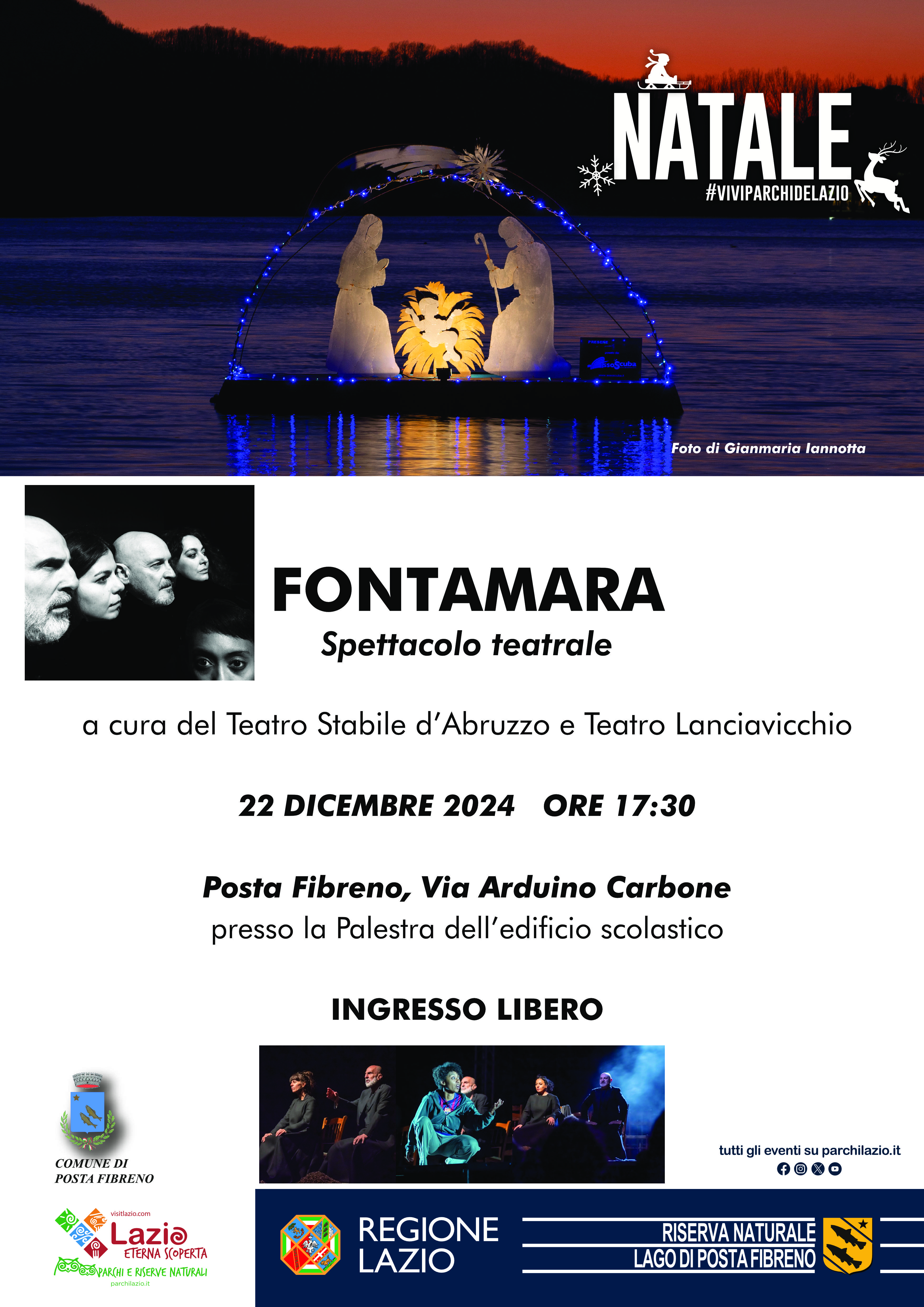 Domenica 22 dicembre 2024, alle ore 17:30, presso la palestra dell’edificio scolastico di Posta Fibreno, in via Arduino Carbone, proseguono con FONTAMARA gli eventi organizzati dalla Riserva Naturale lago di Posta Fibreno per le festività natalizie 2024.