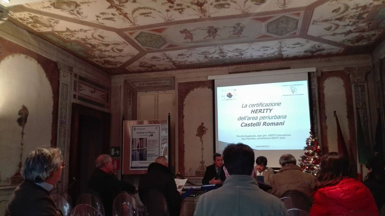 Il 29 settembre 2016 il Parco Regionale dei Castelli Romani ed HERITY International avevano infatti siglato a Marino un accordo specifico per accogliere le istanze di amministratori, tecnici e cittadini verso un nuovo approccio al ricco patrimonio locale, particolarmente emblematico per la compresenza di un elevato numero di valori da preservare (storico-artistici, paesaggistici, naturalistici, geologici, escursionistici, enogastronomici, antropologici…), che raramente si riscontrano con una tale concentrazione. Ecco il motivo di questa nuova esigenza: fare rete, unire "forze e sforzi" con un obiettivo comune e sentito.