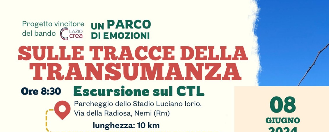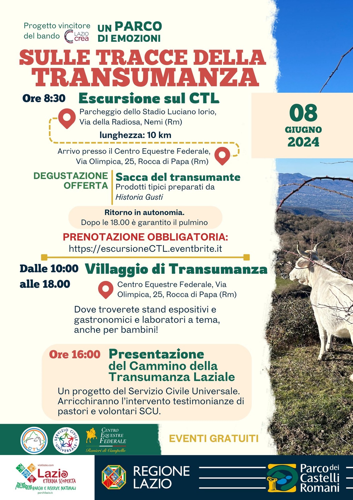 "Un Parco di Emozioni: Sulle tracce della Transumanza" è un evento gratuito, organizzato dal Parco dei Castelli Romani con il contributo della Regione Lazio, finanziato dai fondi dell'Avviso Pubblico di LazioCrea "Per le manifestazioni da realizzare nel territorio della Regione Lazio tra il 15 Marzo e il 30 Giugno 2024", e si svolgerà tra i Comuni di Rocca di Papa, Velletri e Nemi.