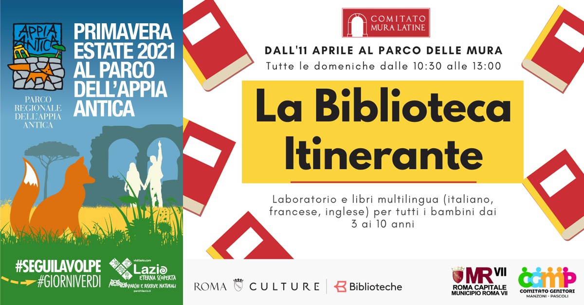 La Biblioteca Itinerante è un progetto ideato e organizzato dal Comitato Mura Latine, in collaborazione con l’Associazione dei Genitori della scuola Manzoni e la biblioteca Nelson Mandela. Ha il patrocinio del Municipio VII e rientra nel programma Segui La Volpe del Parco Regionale dell’Appia Antica.