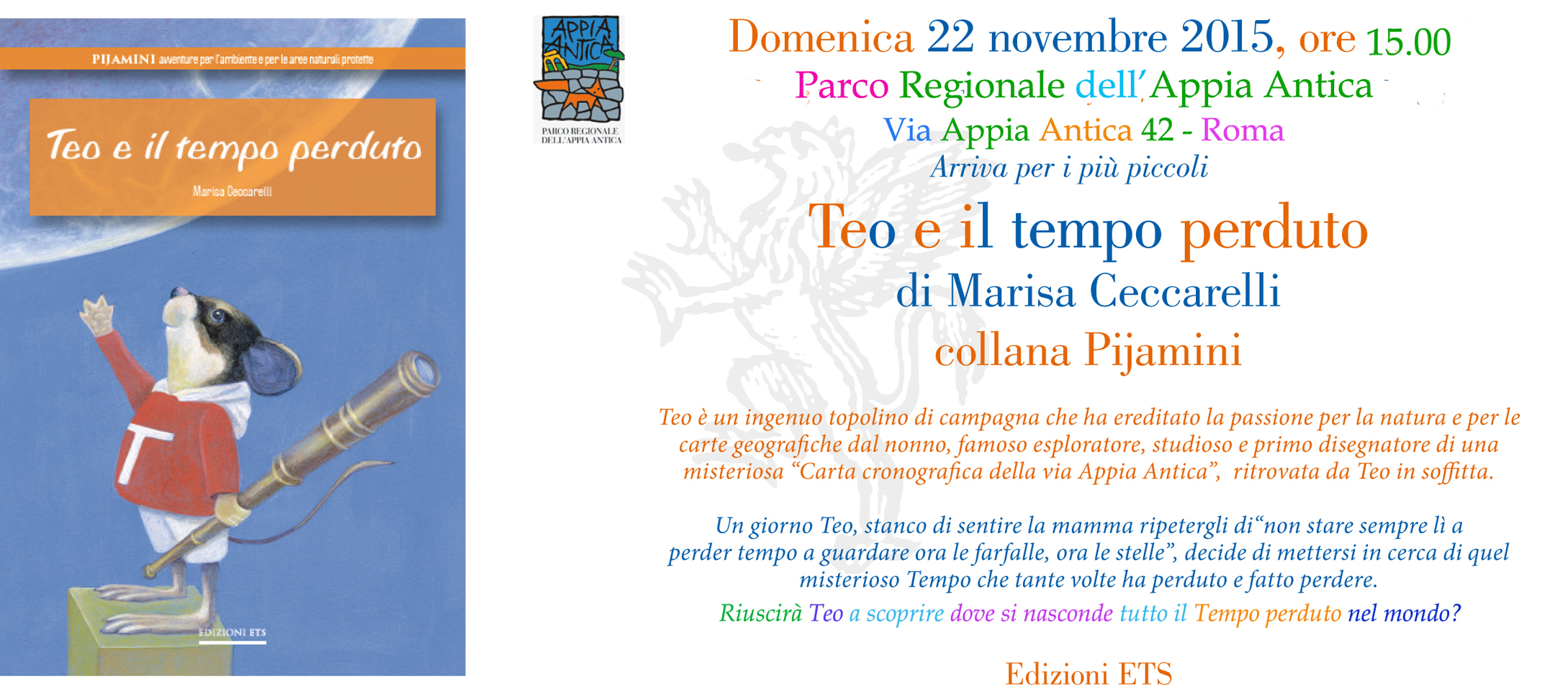 Domenica 22 novembre presso il Parco naturale Regionale Appia Antica si terrà la presentazione del libro "Teo e il tempo perduto" di Marisa Ceccarelli libro della collana Pijamini della Casa Editrice ETS
