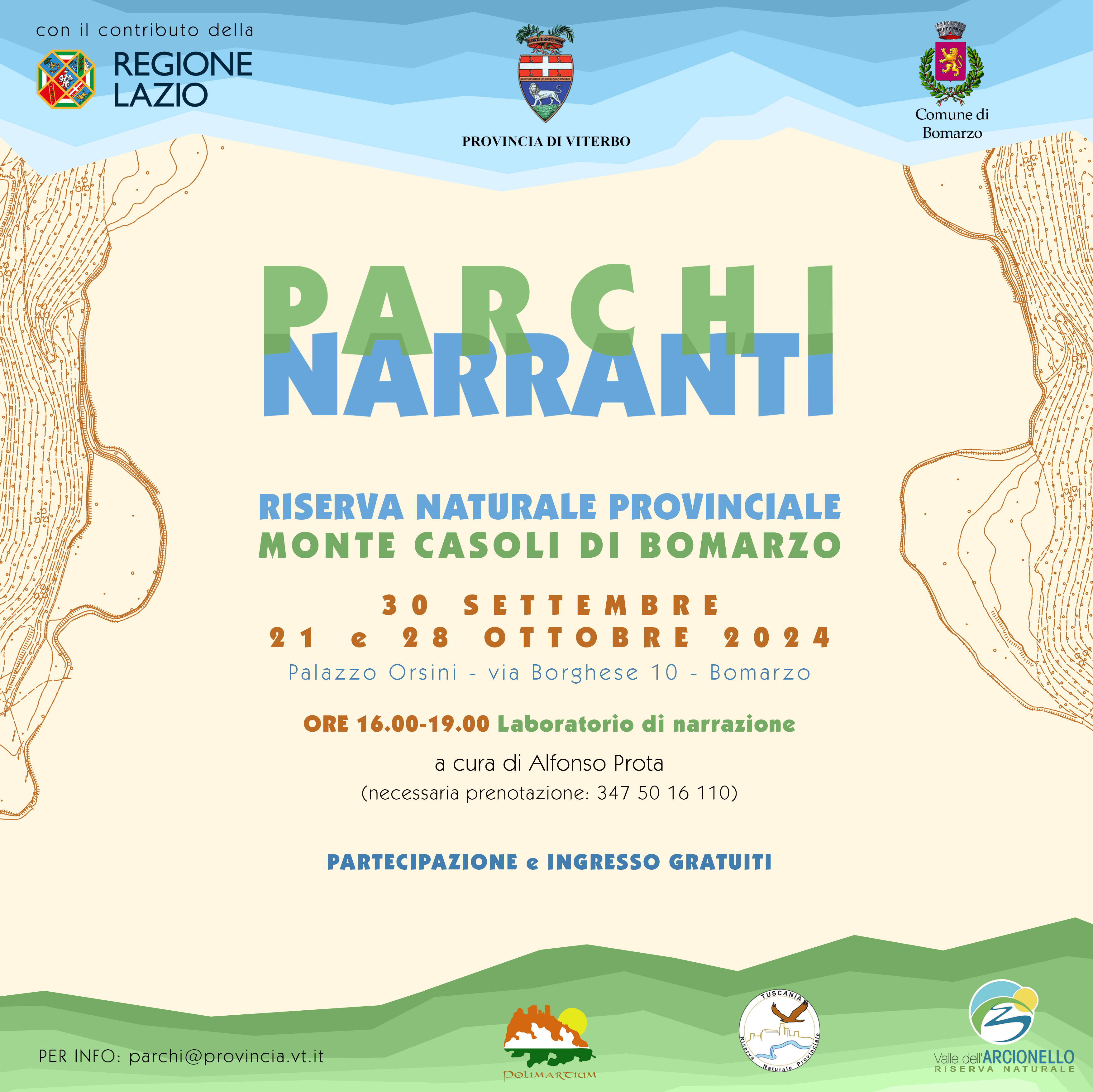Nell'ambito della manifestazione "Parchi Narranti", dopo la prima giornata di Laboratorio tenutasi lunedì 30 settembre, Alfonso Prota lunedì 21 ottobre alle ore 16.00 - sempre a Palazzo Orsini a Bomarzo - dirigerà il secondo di tre incontri del Laboratorio di Narrazione dal titolo "Che cosa sono le nuvole?" che intende lavorare sul paesaggio a partire dai patrimoni narrativi di un territorio e dalle sue rappresentazioni. Il laboratorio continuerà con un altro incontro il 28 ottobre.
