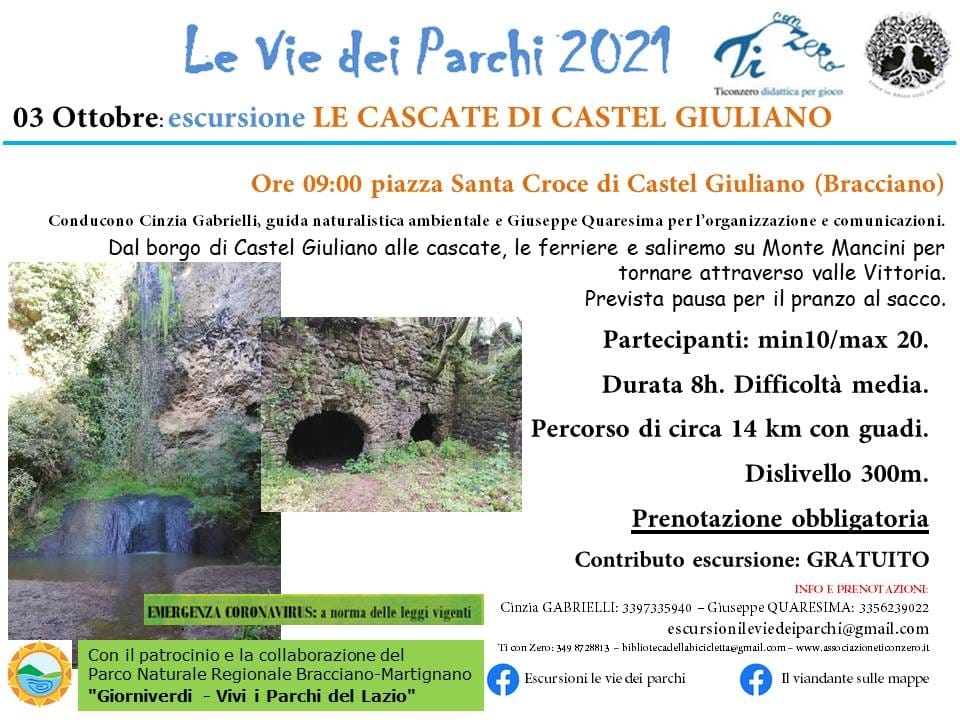 Domenica 3 ottobre ore 9.00 a Castel Giuliano "Le cascate di Castel Giuliano" TiconZero - Le Vie dei Parchi - Tesori Naturali 2021 Giorniverdi - Vivi i Parchi del LazioIniziativa gratuita