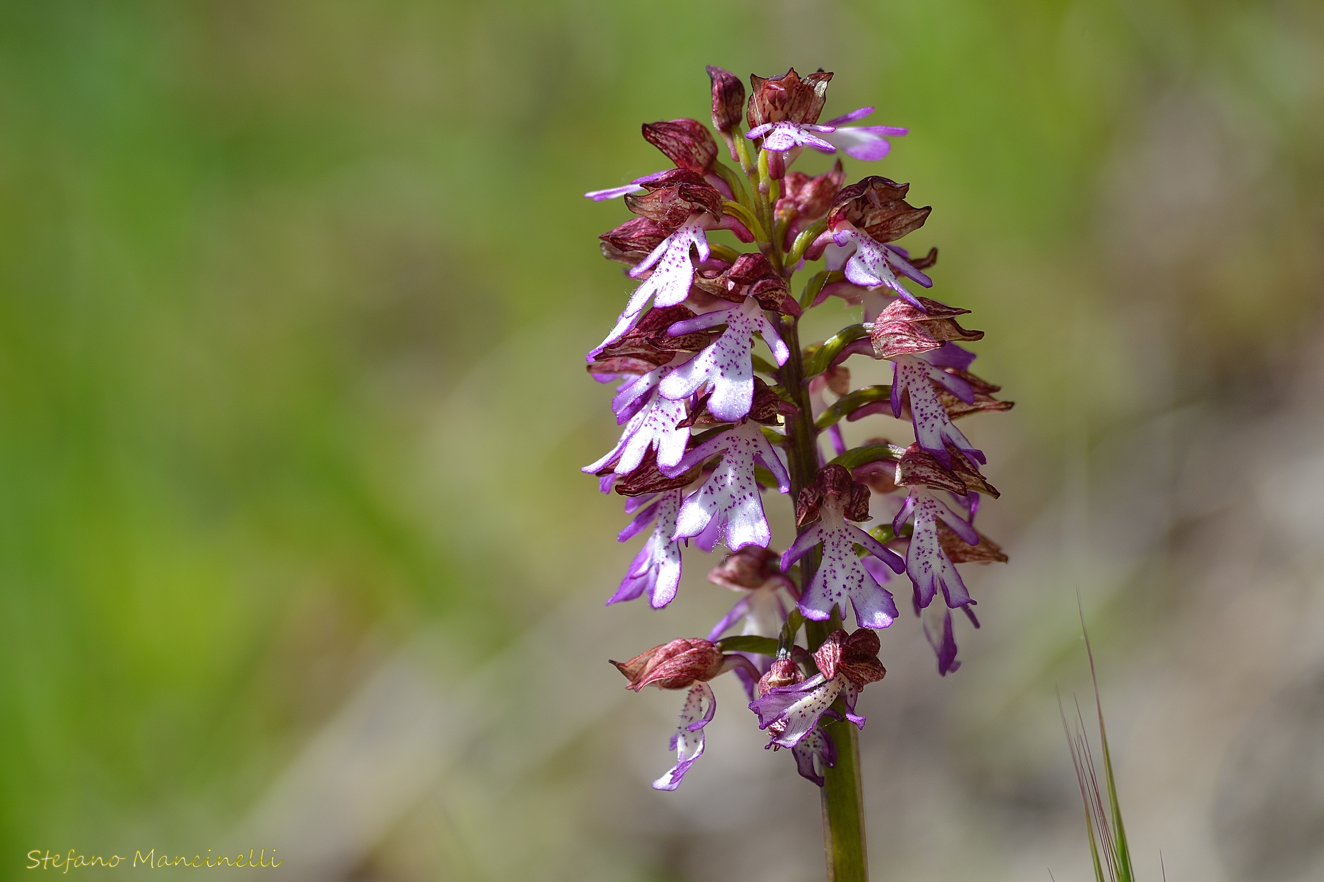 Il nome del genere deriva dal greco orchis = testicolo, per la forma dei rizotuberi che ricordano gli organi seminali maschili. Il nome specifico dal latino purpureus = purpureo, per il colore bruno purpureo del casco. È un pianta robusta, alta dai 30 agli 80 cm, con fusto sfumato di porpora alla sommità, e dotata di due tubercoli ovoidali piuttosto grandi e di alcune radici. Presenta 3-6 foglie basali ovato lanceolate, grandi, suberette, riunite in una rosetta allargata, lucide; 1 o 2 foglie caulinari guainanti. Le brattee membranacee sono sensibilmente più corte dell’ovario, violacee. Ha un’infiorescenza densa e alta, dapprima piramidale-ovata e poi cilindrica, multiflora. Sepali e petali sono conniventi a formare un casco, venato o punteggiato di bruno porpora all’esterno e più chiaro all’interno. Il labello è trilobato, di forma variabile, da biancastro a roseo, con bordi generalmente più scuri ed il centro è ornato da ciuffetti di peli porpora scuro. I lobi laterali sono più stretti e corti del labello mediano, che è diviso in due lobuli allargati all’estremità e divisi da un dentino. Lo sperone è rosa, discendente, lungo circa la metà dell’ovario.