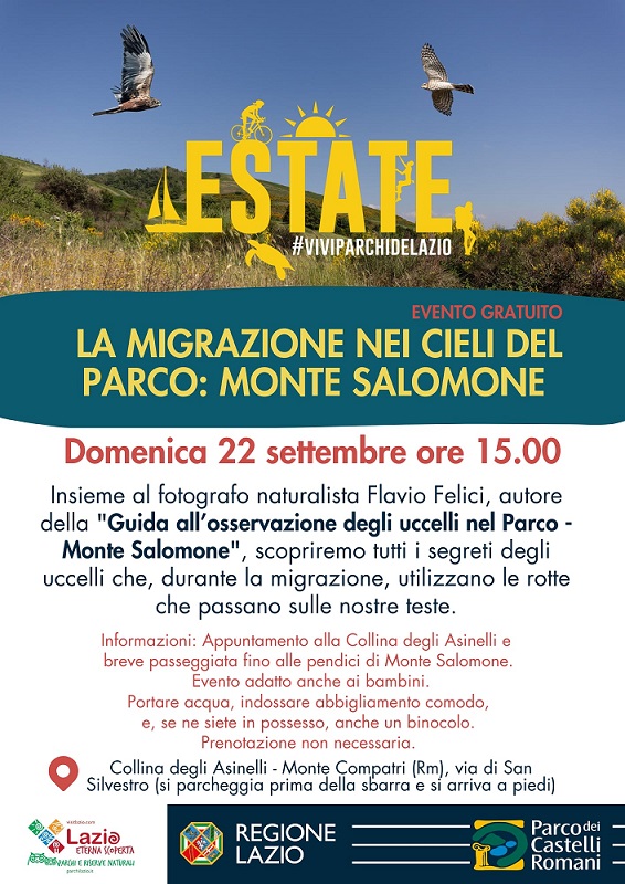 Domenica 22 settembre, l’appuntamento è alle ore 15.00 presso la Collina degli Asinelli – via di San Silvestro – Monte Compatri (RM), con l’evento denominato “La Migrazione nei Cieli del Parco: Monte Salomone”, per scoprire insieme i segreti degli uccelli migratori. La breve passeggiata fino alle pendici di Monte Salomone è adatta anche ai più piccoli. Per partecipare non è necessario prenotare.