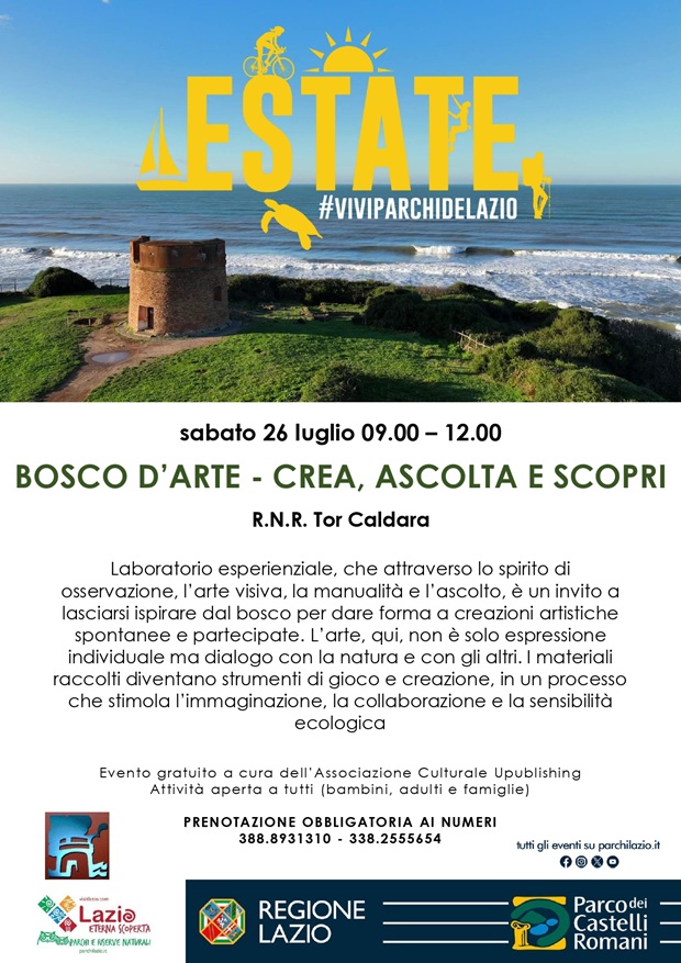 Sabato 26 luglio, appuntamento dalle ore 9.00 alle 12.00 presso la Riserva di Tor Caldara, con l’attività gratuita “Bosco d’Arte - Crea, Ascolta e Scopri”, a cura dell’associazione culturale UPublishing.