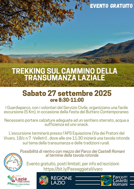 Sabato 27 settembre dalle ore 7.30 alle 11.00, torniamo a camminare sul CTL - Cammino della Transumanza Laziale, con un trekking guidato dai Guardiaparco e dai Volontari del Servizio Civile Universale SCU Borghi e Aree Protette del Lazio.
