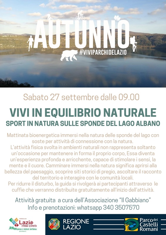 Sabato 27 settembre dalle ore 9.00, si svolgerà l’evento gratuito “Vivi in Equilibrio Naturale” a cura dell’associazione “Il Gabbiano”. Una mattinata di sport immersi nella natura sulle sponde del lago Albano. Tutti i dettagli sono disponibili nella locandina allegata.