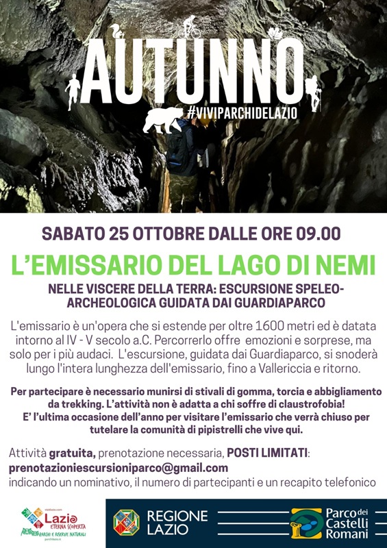 Sabato 25 ottobre alle ore 9.00 l’escursione speleo-archeologica guidata dai Guardiaparco ci porterà nelle viscere della terra, alla scoperta dell’Emissario del lago di Nemi. Un’imponente opera idraulica datata intorno al IV-V secolo a.C., un percorso avventuroso ed emozionante che si estende per oltre 1600 metri fino a Vallericcia e ritorno.