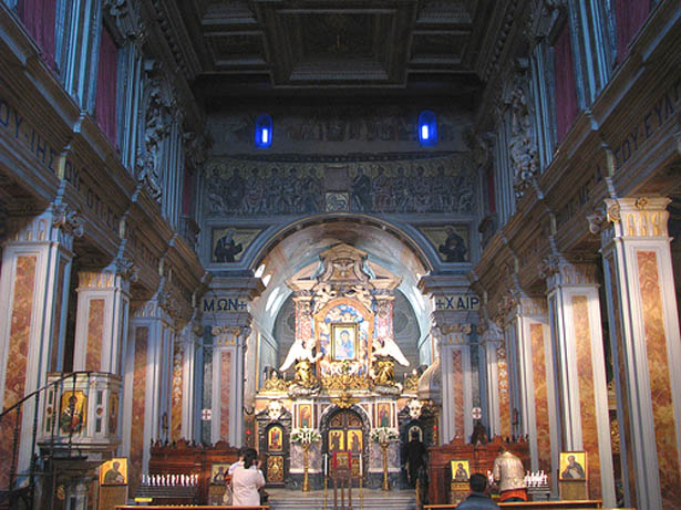 Gioiello monumentale e spirituale della cittadina di Grottaferrata. Da vedere ci sono soprattutto i mosaici dell'interno, soprattutto una Pentecoste sull'arco trionfale, e un ciclo di affreschi duecenteschi che gli storici dell'arte attribuiscono alla scuola romana di Pietro Cavallini. Mèta di pellegrinaggi è una severa icona bizantina raffigurante la Madonna Theotokos (madre di dio), dei secoli XII-XIII e forse proveniente dal distrutto castello di Tuscolo. Bellissimo anche il campanile, a cinque ordini di trifore, del secolo XII. Oltre alla chiesa, l'abbazia conserva anche una Biblioteca con codici dell'XI secolo scritti da San Nilo e dai suoi discepoli, un Laboratorio di restauro e, soprattutto, una ricca raccolta di reperti archeologici rinvenuti nel circondario, molti dei quali esposti sotto il cinquecentesco portico di Giuliano da Sangallo. Vi appartiene, tra l'altro, una famosa stele attica in marmo pentelico datata tra il 430 e il 420 a.C., raffigurante un giovane intento a leggere un rotolo: forse proviene da Costantinopoli, o da una delle lussuose ville che Cicerone si fece erigere nella zona, per poi abbellirle con marmi greci. Di notevole interesse anche la cappella dei Santi fondatori, ricostruita nel 1608 per volontà di Odoardo Farnese, abate commendatario dell'abbazia, e affrescata dal Domenichino.