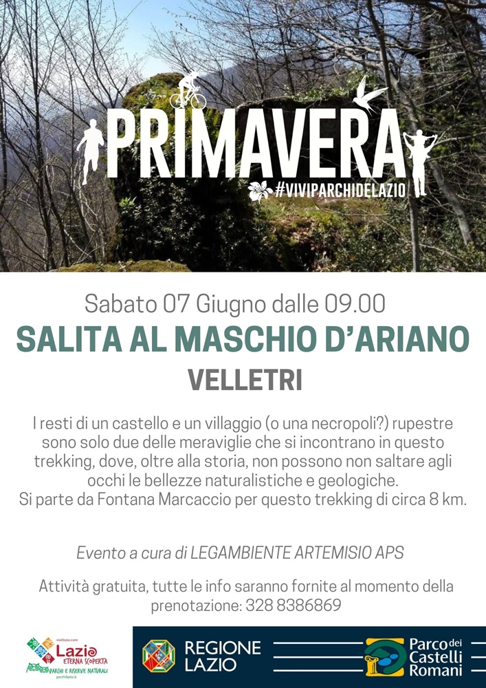 Sabato 7 giugno, l’appuntamento con l’evento gratuito a cura di Legambiente Artemisio Aps, è con il trekking “Salita al Maschio d’Ariano". Circa 8 Km di percorso partendo da Fontana Marcaccio a Velletri (RM), per una visita guidata in cui si parlerà di storia, senza tralasciare le bellezze naturalistiche e geologiche che si incontreranno lungo il cammino. Tutti i dettagli sono disponibili nella locandina allegata.