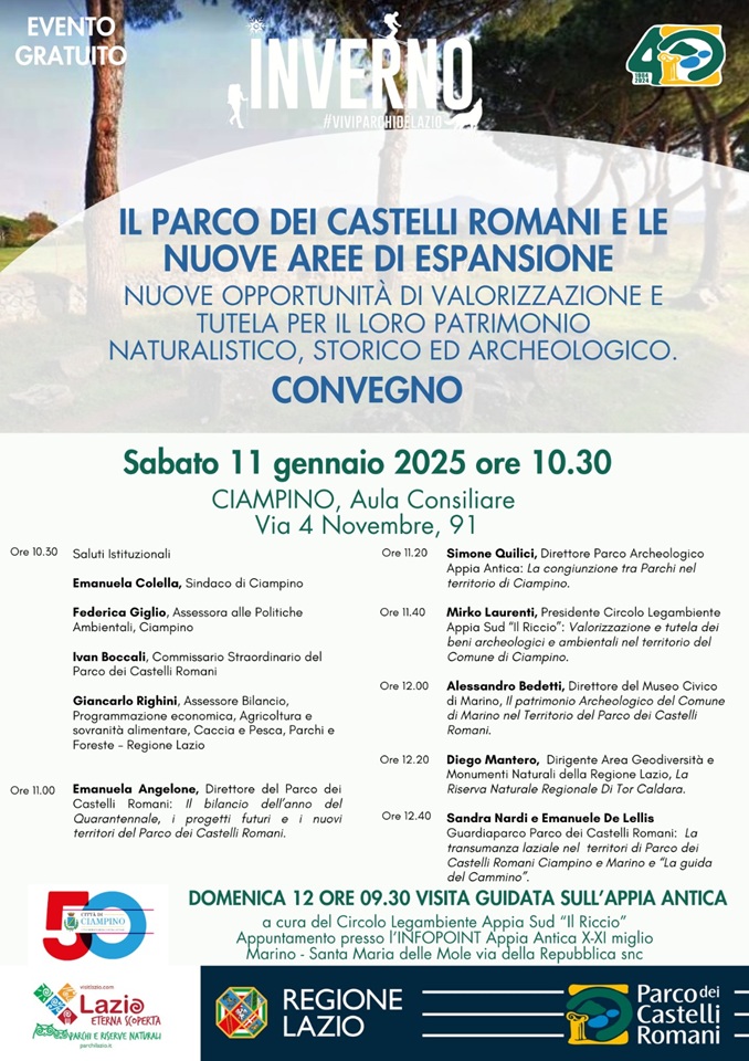 Sabato 11 gennaio alle 10.30, si terrà presso l’Aula Consiliare del comune di Ciampino - via 4 Novembre, 91 – l’evento di chiusura del quarantennale del Parco, con il convegno ad ingresso libero “Il Parco dei Castelli Romani e le Nuove Aree di Espansione. Nuove Opportunità di Valorizzazione e Tutela per il loro Patrimonio Naturalistico, Storico ed Archeologico”.