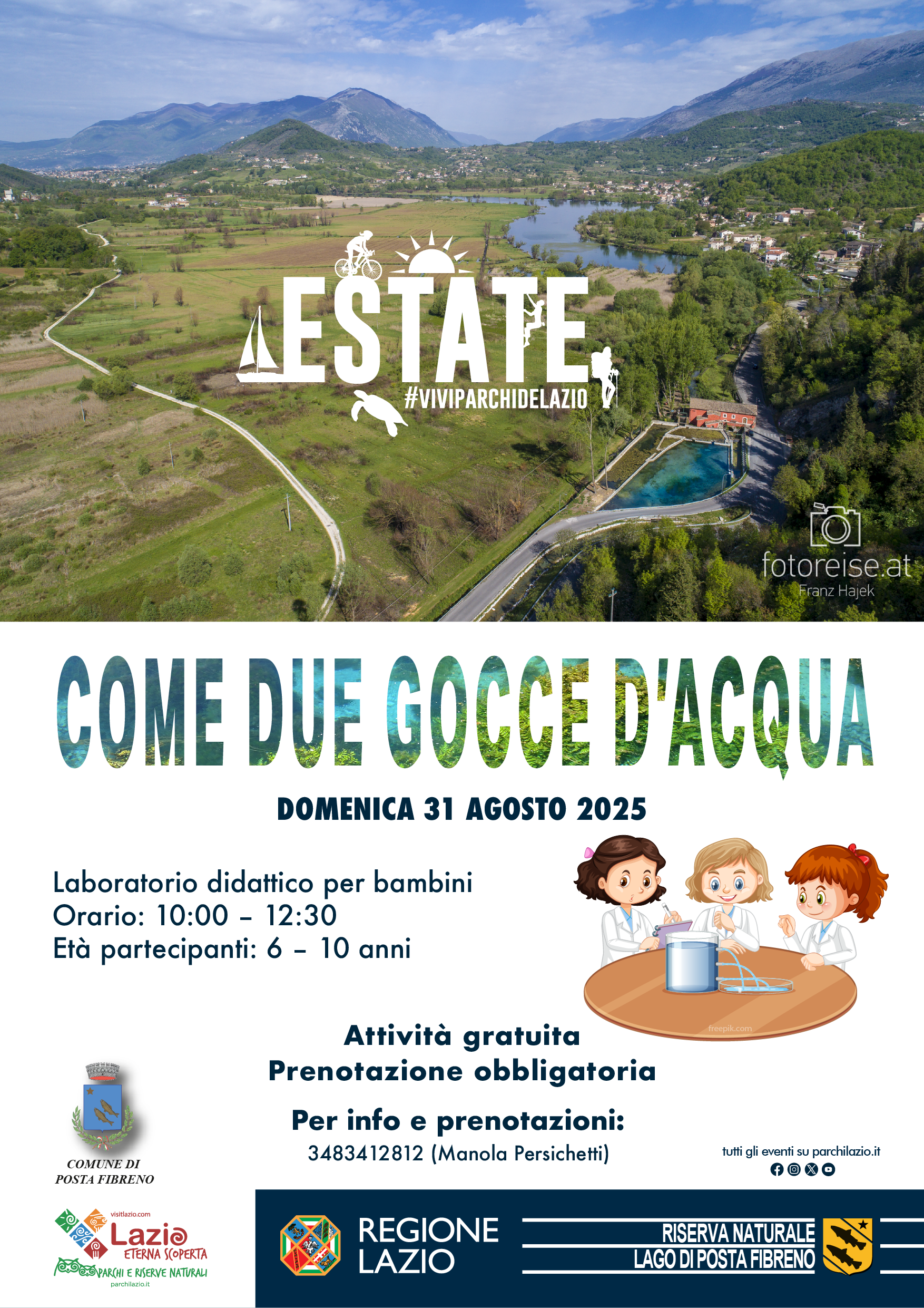 Domenica 31 agosto 2025, proseguono gli eventi organizzati dalla Riserva Naturale lago di Posta Fibreno per l’estate con “Come due gocce d’acqua”, laboratorio didattico per bambini dai 6 ai 10 anni.