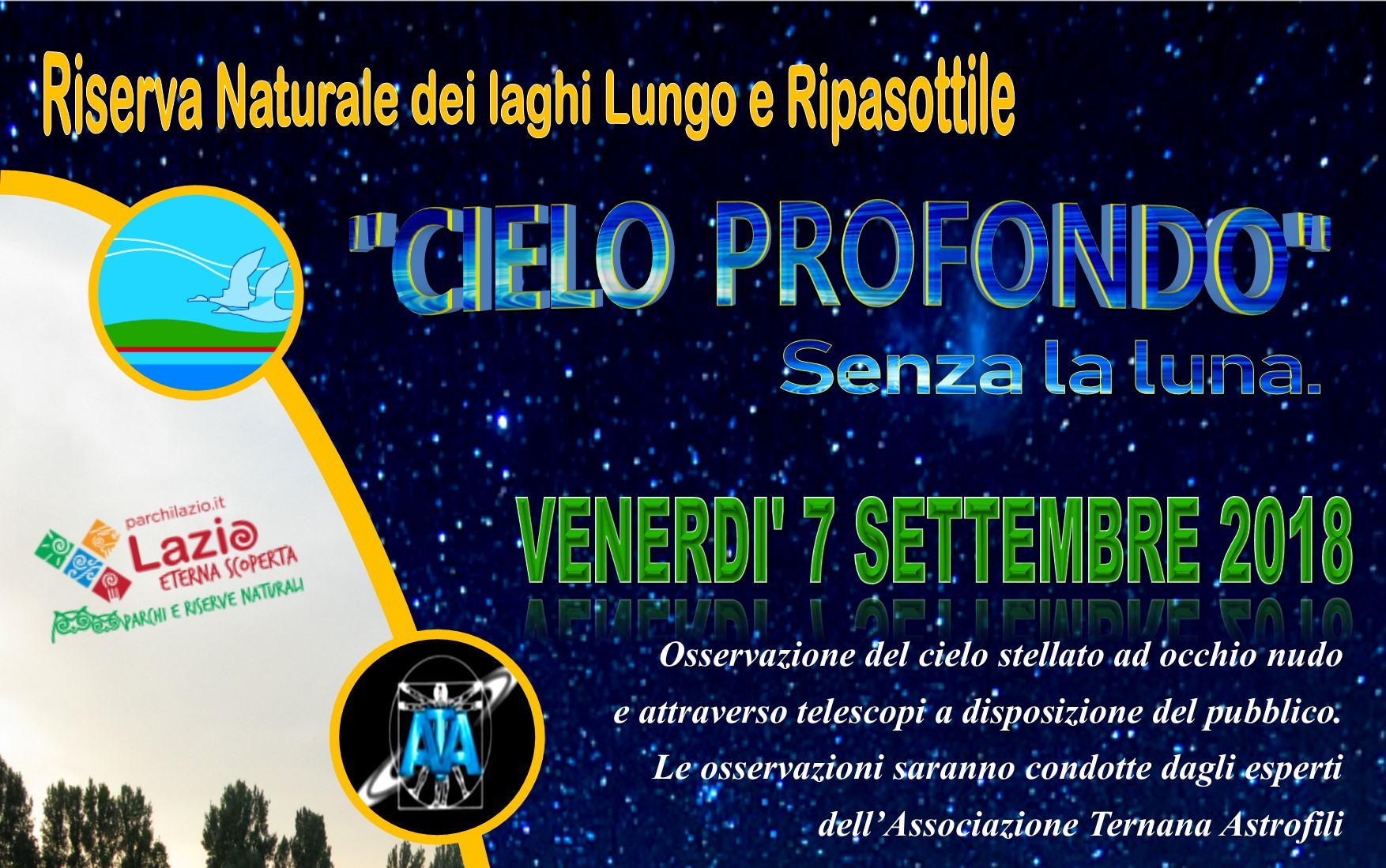 Venerdì 7 settembre 2018, a partire dalle ore 18.00, presso il Centro Visite del Lago Lungo, vi aspettiamo numerosi per il prossimo appuntamento di fine estate. Un'intera serata dedicata alla divulgazione astronomica, dove esperti astrofili ci condurranno alla scoperta dello spazio misterioso. Si parlerà delle galassie e ci sarà la possibilità di ascoltare e addirittura vedere gli affascinanti uccelli notturni. Inoltre per deliziare i vostri palati non mancheranno prodotti gastronomici del nostro territorio unici e ricercati.