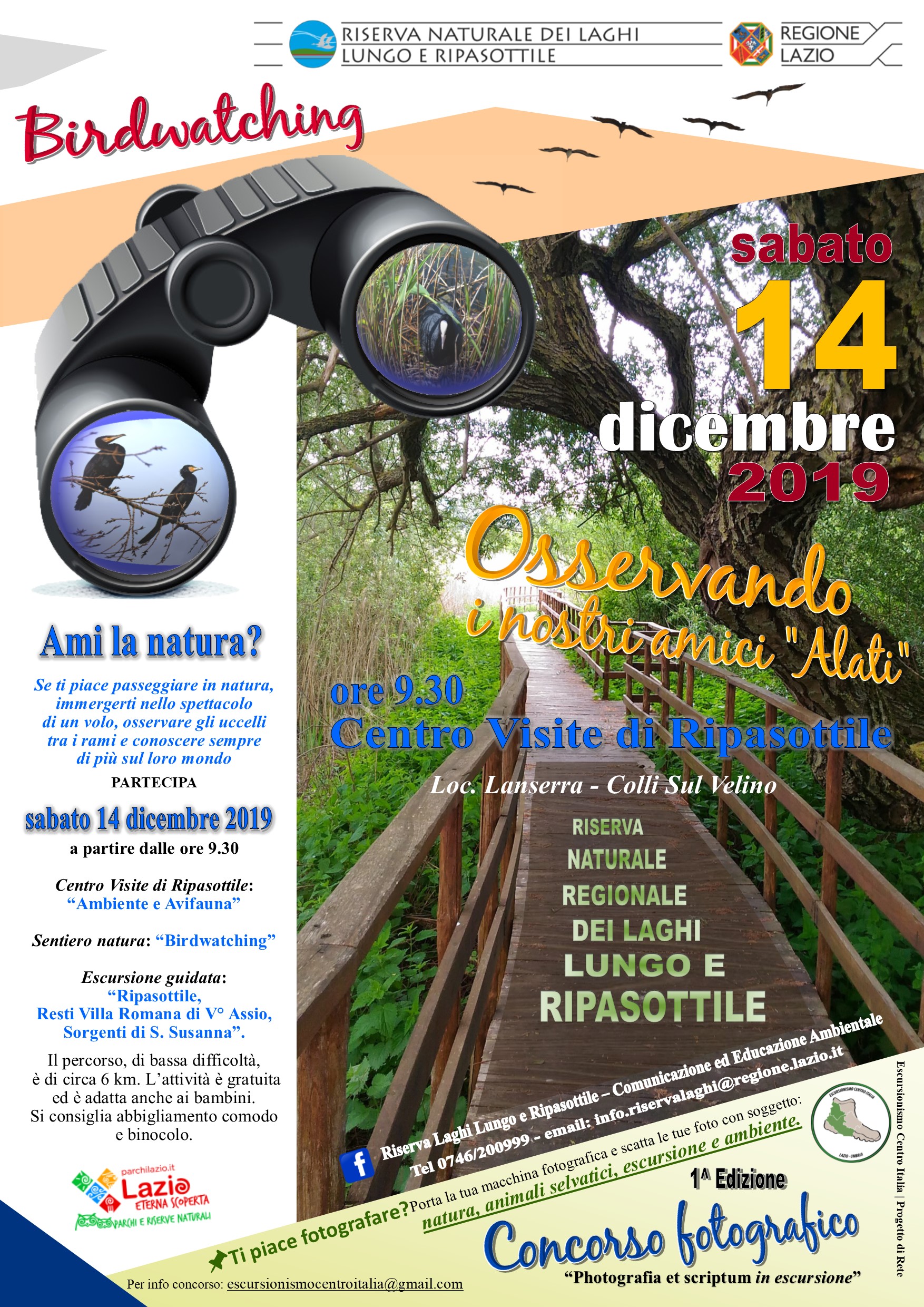 Se ti piace passeggiare in natura, immergerti nello spettacolo di un volo, osservare gli uccelli tra i rami e conoscere sempre di più sul loro mondo unisciti a noi sabato 14 dicembre 2019. A partire dalle ore 9,30 presso il Centro Visite di Ripasottile alcune notizie su “Ambiente e Avifauna” della Riserva a seguire “Birdwatching” sul sentiero natura e per finire escursione guidata da “Ripasottile ai Resti della Villa Romana di V° Assio fino alle Sorgenti di S. Susanna”. Il percorso, di bassa difficoltà, è di circa 6 km. L’attività è gratuita ed è adatta anche ai bambini.Si consiglia abbigliamento comodo e binocolo. Inoltre se porti con te una macchina fotografica e scatti qualche foto puoi partecipare ad un concorso fotografico. Dettagli e riferimenti nella locandina allegata.