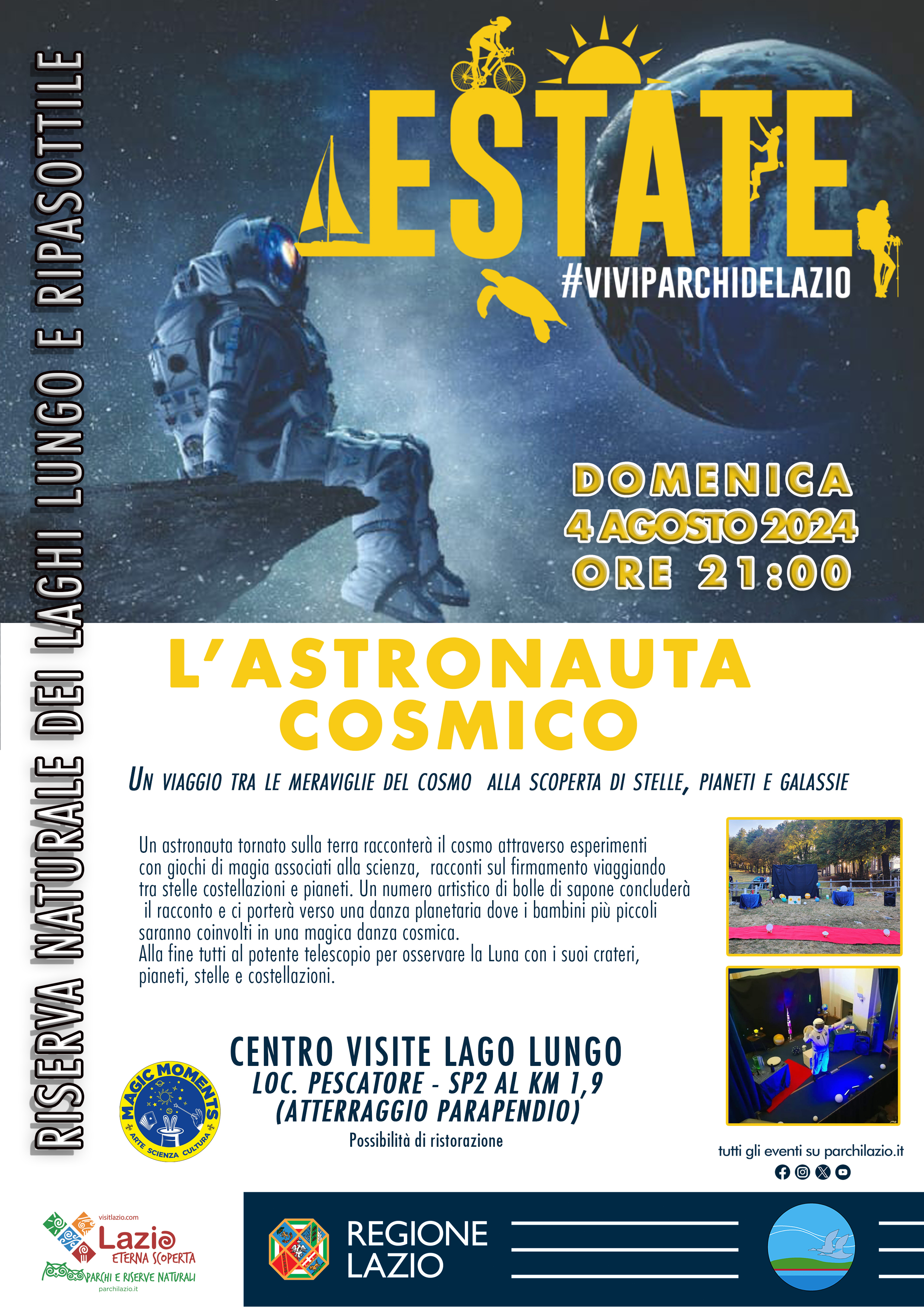Un astronauta tornato sulla terra racconterà il cosmo attraverso esprimenti con giochi di magia associati alla scienza, racconti sul firmamento viaggiando tra stelle costellazioni e pianeti. Un numero artistico di bolle di sapone concluderà il racconto e ci porterà verso una danza planetaria dove i bambini più piccoli saranno coinvolti in una magica danza cosmica. Alla fine tutti al potente telescopio per osservare la Luna con i suoi crateri, pianeti, stelle e costellazioni.