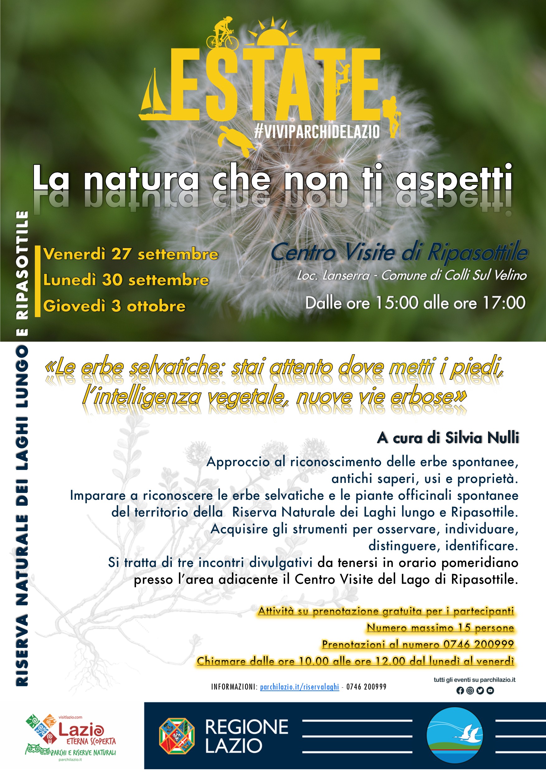 La Riserva a conclusione degli eventi estate gratuiti per i partecipanti finanziati dalla Regione Lazio per gli eventi estate 2024 nei Parchi del lazio, organizza degli incontri divulgativi che si terranno a cura di Silvia Nulli esperta di piante erbacee.