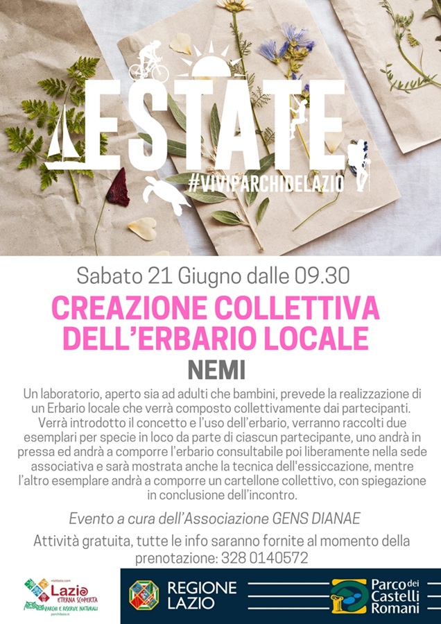 Sabato 21 giugno alle ore 9.30, Nemi (RM) sarà protagonista di un laboratorio gratuito per adulti e bambini, che prevede la realizzazione di un erbario locale, che verrà composto collettivamente dai partecipanti.
