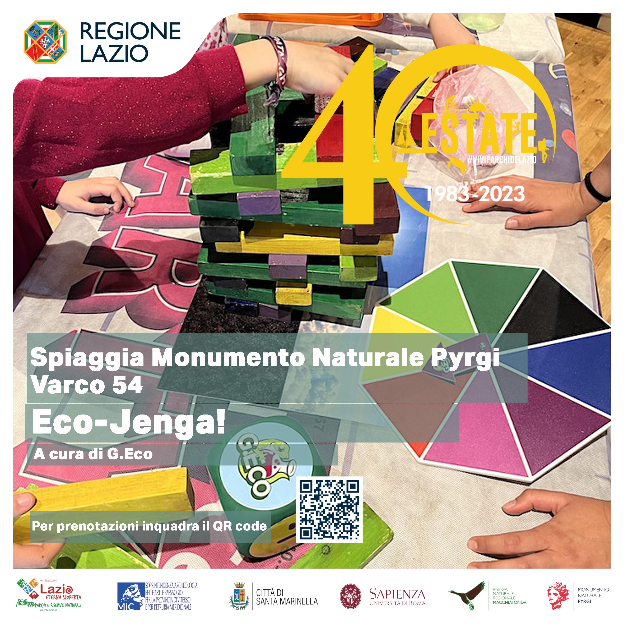 In occasione del 40 esimo anniversario dell'istituzione della Riserva Naturale di Macchiatonda, sabato 29 e domenica 30 luglio 2023 presso la Spiaggia del Monumento Naturale di Pyrgi - ingresso al Varco 54 "Eco-Jenga! acura di G.Eco Siete pronti a scoprire i delicati equilibri nascosti negli ecosistemi? Come? Giocando con una divertente torre fatta da tanti mattoncini colorati! Ogni colore della torre è una specie e ciascun mattone poggia sugli altri, proprio come negli ambienti naturali in cui tutti sono collegati da una fitta rete di relazioni ecologiche. Se si tolgono o aggiungono pezzi la torre cambierà il suo equilibrio. Riusciremo a non farla crollare? E chissà che qualche piccolo abitante degli ecosistemi non sia venuto a farsi conoscere…da vicino!