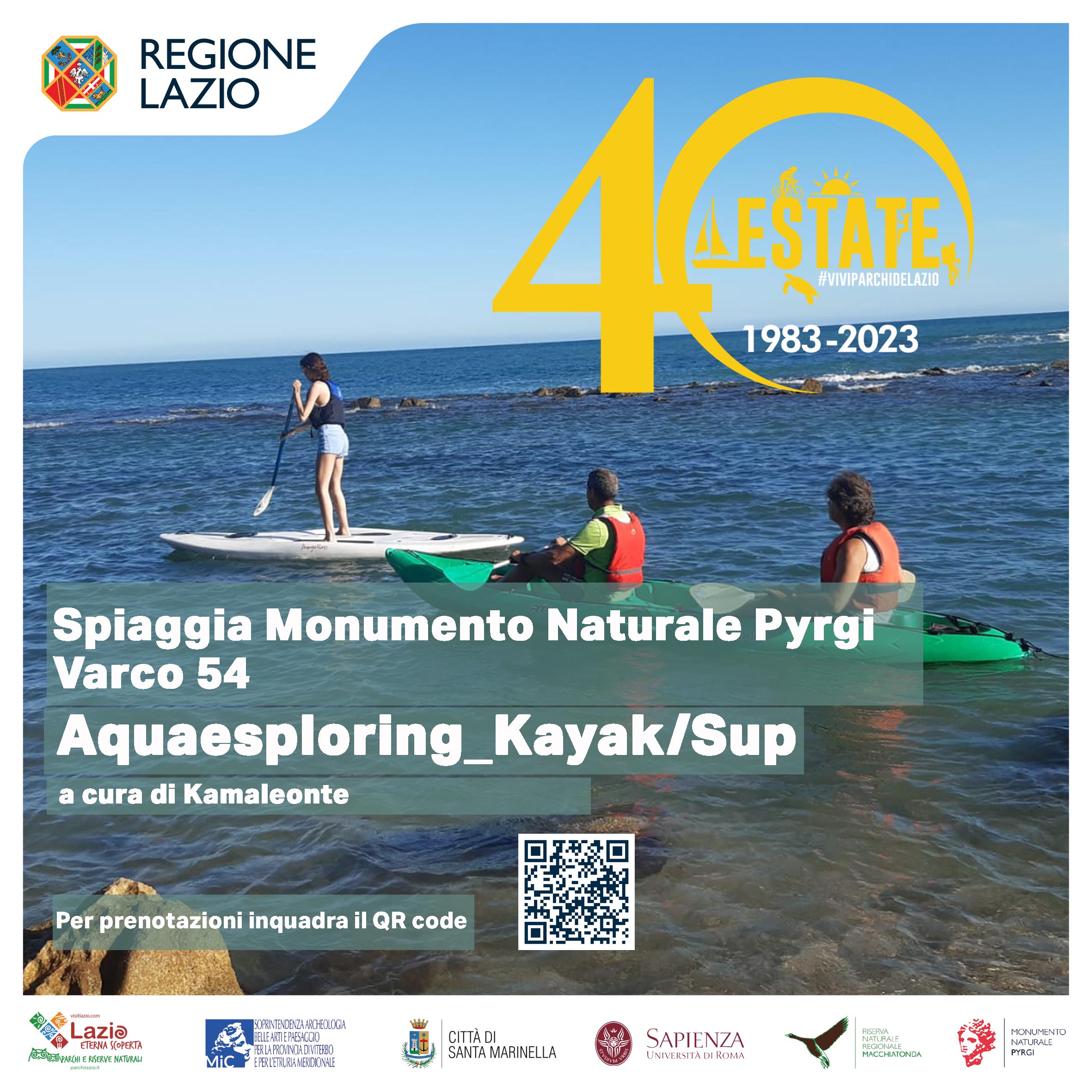 • "AQUAESPLORING_KAYAK/SUP"​ presso la Spiaggia del Monumento Naturale di Pyrgi - ingresso al Varco 54  a cura di Kamaleonte, escursione in kayak e sup dell’area marina e naturalistica dal Castello di Santa Severa alla riserva naturale di Macchiatonda. Attività particolarmente indicate per chi vuole vivere in relax il mare acquisendo tecniche base di sport acquatici eco sotenibili