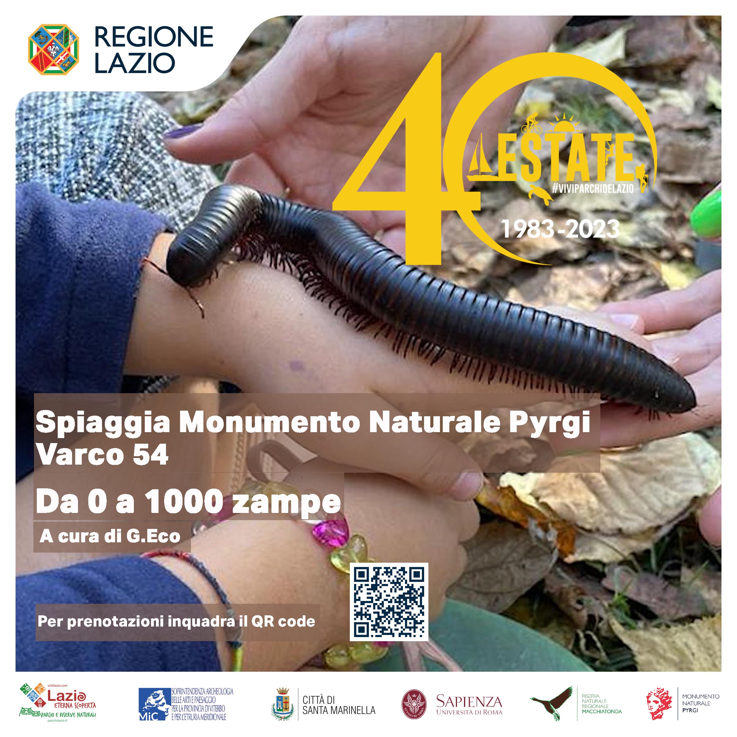 • "DA 0 A 1000 ZAMPE"​ presso la Spiaggia del Monumento Naturale di Pyrgi - ingresso al Varco 54  a cura di G.Eco Chi l'ha detto che in città non ci sia nulla di naturale da vedere? Al contrario, è pieno di piccoli amici pronti a fare la conoscenza di tanti piccoli scienziati! Un laboratorio che permette ai bambini di guardare negli occhi tanti animali da zero a mille zampe, grazie a un memory molto speciale. Cosa aspetti a giocare con noi?