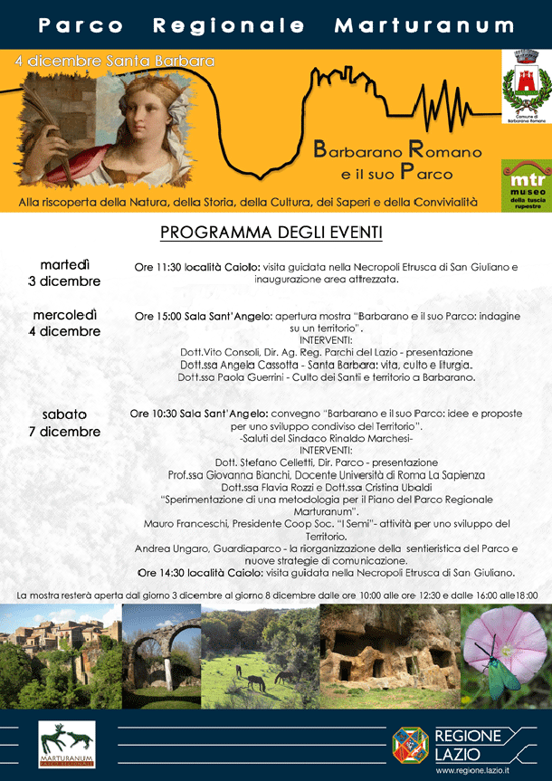 In occasione delle festività in onore di Santa Barbara, patrona di Barbarano Romano (Vt), il Parco Marturanum organizza una serie di eventi alla riscoperta della natura, della storia, della cultura dei saperi e della convivialità. Da martedì 3 dicembre fino a sabato 7 sono previste in calendario: visite guidate alla necropoli di Caiolo, seminari, convegni e la mostra " Barbarano e il suo parco: indagine su un territorio. Questa ultima, allestita presso la Sala Sant'Angelo, rimarrà aperta fino all'otto dicembre con il seguente orario: dalle 10.00 alle 12.30 e dalle 16.00 alle 18.00.