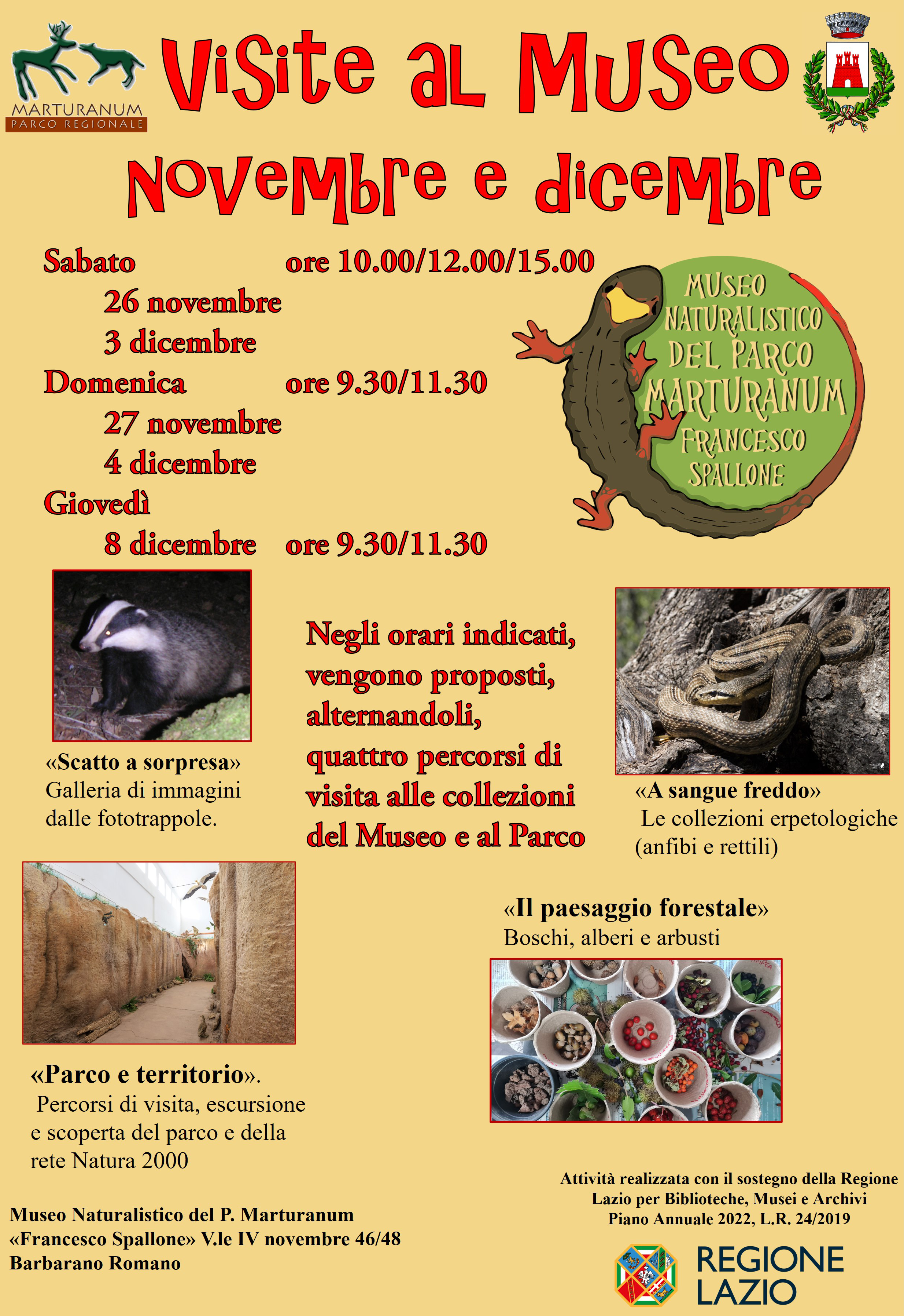 Nell'ultimo fine settimana di novembre e nel primo di dicembre (più il giorno 8 dicembre) il museo naturalistico "Francesco Spallone", a Barbarano Romano, sarà aperto per visite guidate al suo interno.