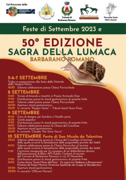 L'ormai storica Sagra della Lumaca (quest'anno alla sua 50ma edizione!), si terrà nei giorni 8, 9 e 10 settembre