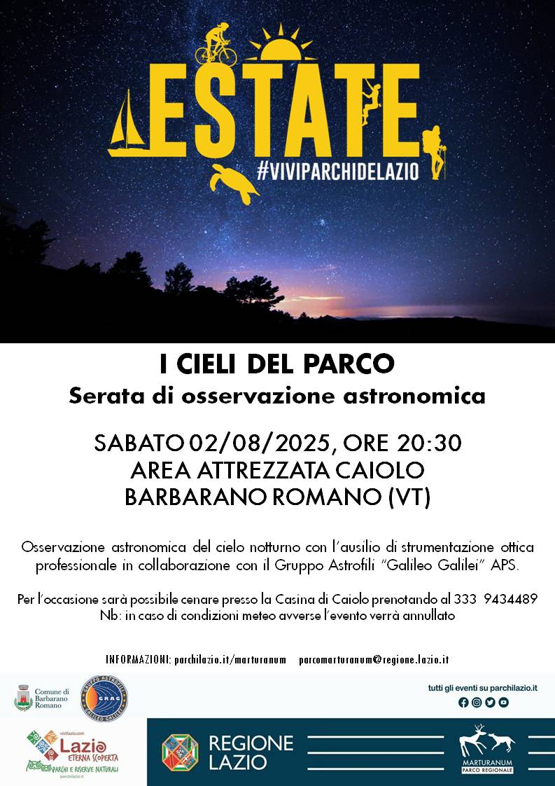 Torna l'appuntamento estivo di osservazione del cielo notturno al Parco Marturanum. I soci del GrAG (Gruppo Astrofili Galileo Galilei), come ogni anno, mettono a disposizione attrezzature sofisticate, competenze ed entusiasmo per coinvolgere curiosi e appassionati nell'attività che ha sempre affascinato gli esseri umani, ancor prima che potessero definirsi tali: sollevare lo sguardo per scrutare l'immensità del cielo stellato!