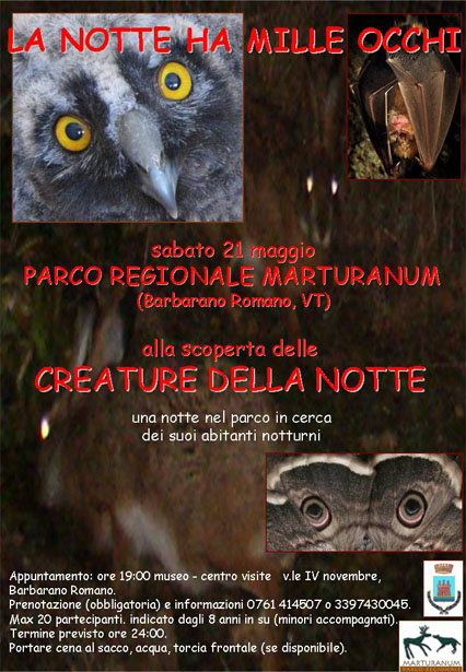 In giro nel Parco alla scoperta dei suoi abitanti notturni. Appuntamento alle 19.00 al centro visite a Barbarano Romano (VT), cena al sacco, acqua, torcia frontale (se disponibile) termine previsto alle 24.00. Prenotazione al n° 0761 414507, 339-7430045. La visita è gratuita.