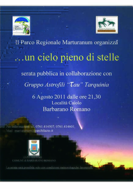 Il Parco Marturanum organizza una serata pubblica di osservazione astronomica in collaborazione con il Gruppo Astrofili "Tau" di Tarquinia.