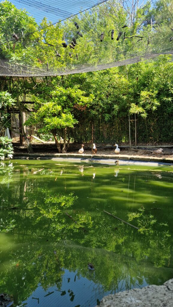 Un’ultima attività è quella di portare da mangiare allo Stagno, all’interno del quale si trovano infinite tartarughe d’acqua e parecchi anatidi. Gli ospiti più particolari di questo luogo, oltre ad un chukar, sono Caterina, una emù con un caratterino niente male, Mirta, un’elegantissima gru coronata, e una vetusta cicogna di oltre 30 anni. Oltre a loro, chi si occupa dello Stagno porta da mangiare anche a Frank e Giano, due cercopitechi verdegrigi, scimmie africane dalla colorazione molto particolare, la cui attività preferita è proprio osservare gli ospiti dello stagno sbrigare le loro faccende.