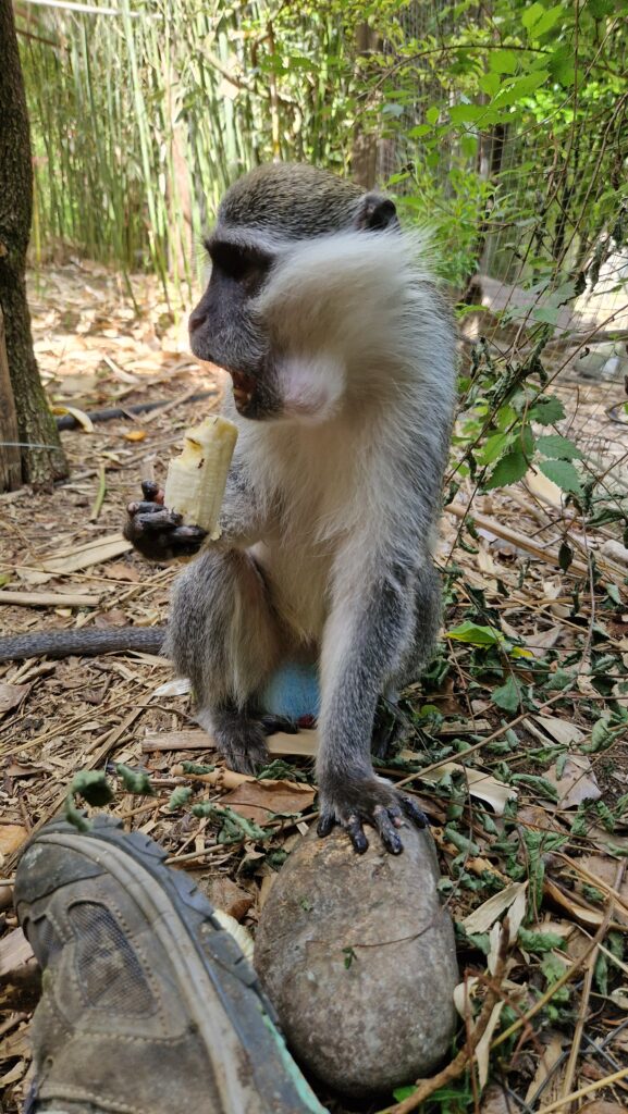 Salendo, ci occupiamo sia di pulire i dormitori degli animali, che di fornire loro il nutrimento necessario ad affrontare la giornata. Il primo gruppo che incontriamo è quello dei macachi berberi, costituito da sette scimmie un po’ schive ma molto buffe. Subito dopo di loro si trova un’altra bertuccia, Berta, con un carattere piuttosto particolare che le ha permesso di andare a vivere in un “attico” tutto suo. Dopo Berta, portiamo da mangiare ad un piccolo gruppo di macachi di Giava, che non amano particolarmente noi esseri umani, ma che in compenso amano moltissimo l’insalata fresca e croccante.