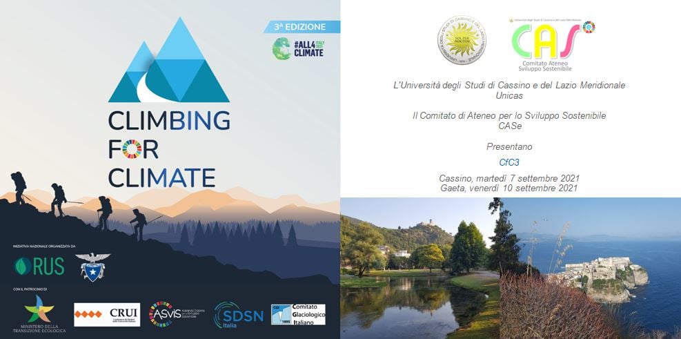Dal 4 al 19 settembre 2021, si tiene la terza edizione di Climbing for Climate, un evento dimostrativo organizzato dalla RUS (Rete delle Università per lo Sviluppo Sostenibile) e dal CAI (Club Alpino Italiano), per sensibilizzare l’opinione pubblica locale, nazionale e internazionale sugli effetti dei cambiamenti climatici in atto, alla luce degli obiettivi dell’agenda 2030 dell’ONU. A tal riguardo, le Università RUS che aderiscono, organizzano escursioni e iniziative aperte alle proprie comunità.