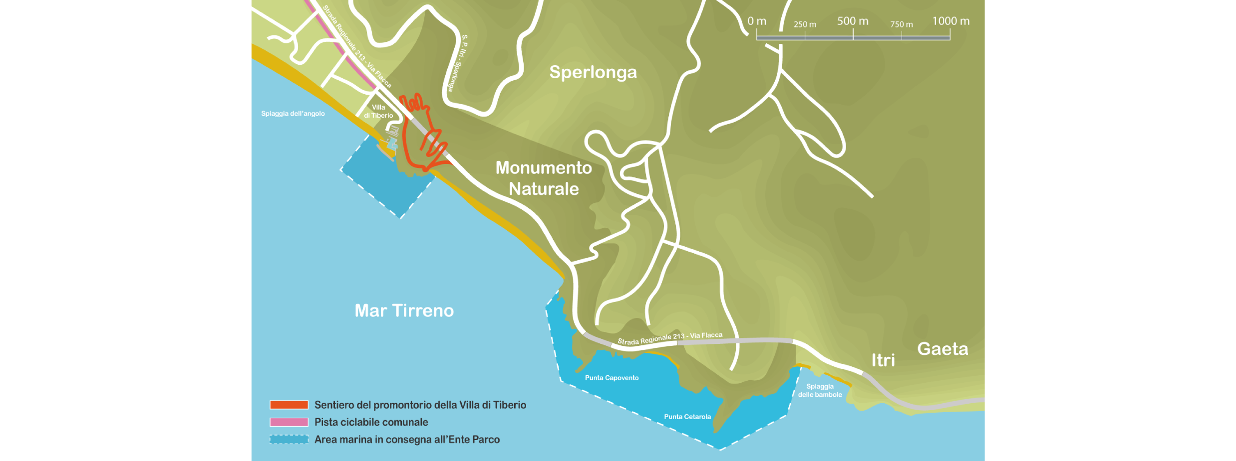A natural area of great charm that extends discontinuously along the coast of the Sperlonga area, from Monte Ciannito to the border with the municipality of Itri. Characterized by three rocky promontories and spectacular cliffs, the area features the typical vegetation of the Mediterranean scrub, embellished by the presence of the dwarf palm, the only native palm in Europe. The most important faunal populations are made up of birds of prey, herring gulls and kingfishers, as well as mammals such as badgers and hedgehogs, which live in the hinterland. Important nesting sites for the peregrine falcon have also been found in this area. Sperlonga, like many other places on the southern Pontine coast, was a holiday destination for the Roman patriciate. The grandiose Villa of Emperor Tiberio, discovered in the 1950s during the construction of today's Via Flacca, gave rise to a museum of national importance which houses important archaeological finds, including imposing sculptures depicting the exploits of Ulysses. Finally, some small but fascinating coastal sea caves are worth mentioning.
