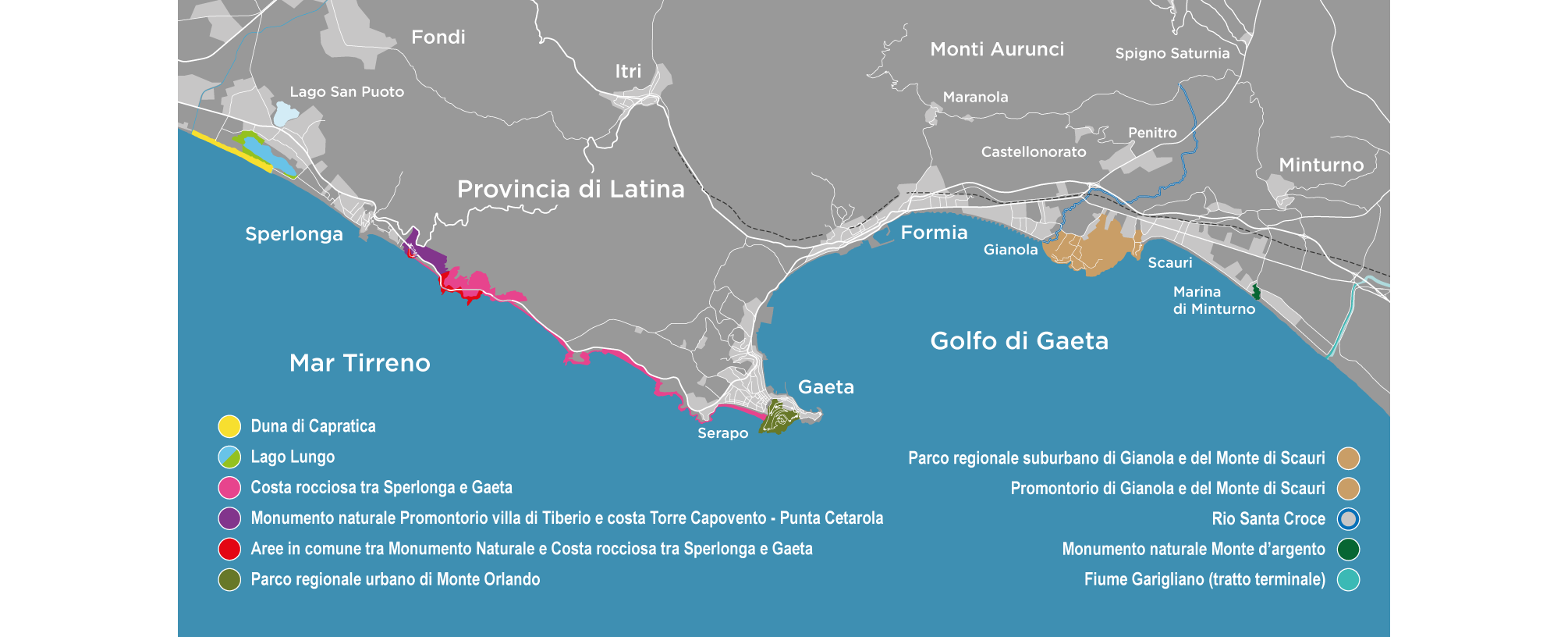 An enchanting corner of lower Lazio which extends over 292 hectares between the territories of Formia and Minturno. The mild Mediterranean climate invites pleasant visits at any time of the year. Here, the Mediterranean scrub, in some areas, transforms into magnificent woods, among which the evocative cork grove of Monte di Scauri stands out. The vegetation of the cliffs is an extraordinary example of adaptation to nature of plants used to living near the sea, defying strong winds and high salinity. Despite the strong surrounding anthropization, the fauna is rich and varied, with terrestrial mammals and numerous bird species that exploit the strategic position of the Gianola promontory on the migratory routes between Europe and Africa. The seabed, which alternates rocky and sandy stretches, is home to rich and diverse animal and plant populations. Gianola also represents an important archaeological site, with the remains of an extensive villa from the late Republican era, built around 50 BC. presumably by Mamurra, a knight friend of Julius Caesar, whose use continued into the late period with uses different from the initial one. A church, the sixteenth-century coastal watchtowers (among which the Scauri one is still well maintained) and the “Porticciolo di Gianola” (locally called “Porticciolo Romano”) date back to the Middle Ages, built in the 1930s on the remains of a fishpond of the aforementioned villa.