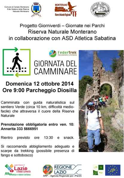 In occasione della Giornata del Camminare di domenica 12 ottobre, promossa da FederTrek nell'ambito del Progetto Giorniverdi - Giornate dei Parchi dell'Agenzia Regionale Parchi, la Riserva Naturale Monterano in collaborazione con l'ASD Atletica Sabatina organizza una camminata con guida naturalistica nel cuore della Riserva Naturale.