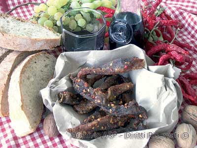 Tagliare un pezzo di carne a fette della larghezza di un dito. Passare le fette di carne in un misto di sale e peperoncino tritato e infilarle su alcuni ganci che dovranno essere appesi vicino al fuoco o dentro il camino quando si pegne la fiamma ma la brace e la cenere sono ancora calde.