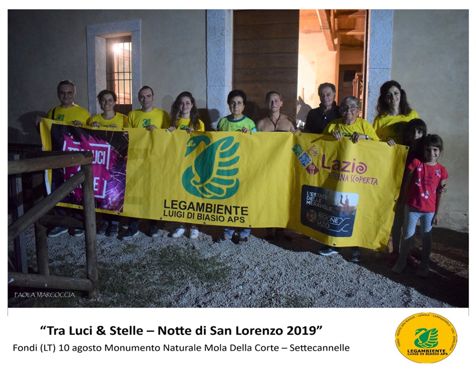 Grande successo per l’iniziativa “Tra Luci & Stelle – Notte di San Lorenzo 2019” organizzata dal Circolo Legambiente Intercomunale “Luigi Di Biasio” APS nell’ambito delle manifestazioni della Regione Lazio “L’Estate delle Meraviglie” presso il Monumento Naturale Mola Della Corte – Settecannelle a Fondi. L’evento ha avuto il patrocinio del Parco Naturale dei Monti Aurunci ed ha dato la possibilità di osservare al telescopio la Luna e i pianeti Giove e Saturno, ascoltare interventi musicali a tema, visitare una mostra fotografica sul cielo e l’inquinamento luminoso e degustare un buffet plastic free con prodotti locali. I numerosi visitatori (almeno 300) hanno così potuto apprezzare le potenzialità di Mola della Corte – Settecannelle, un luogo di alto pregio naturalistico a breve distanza dal centro abitato di Fondi.