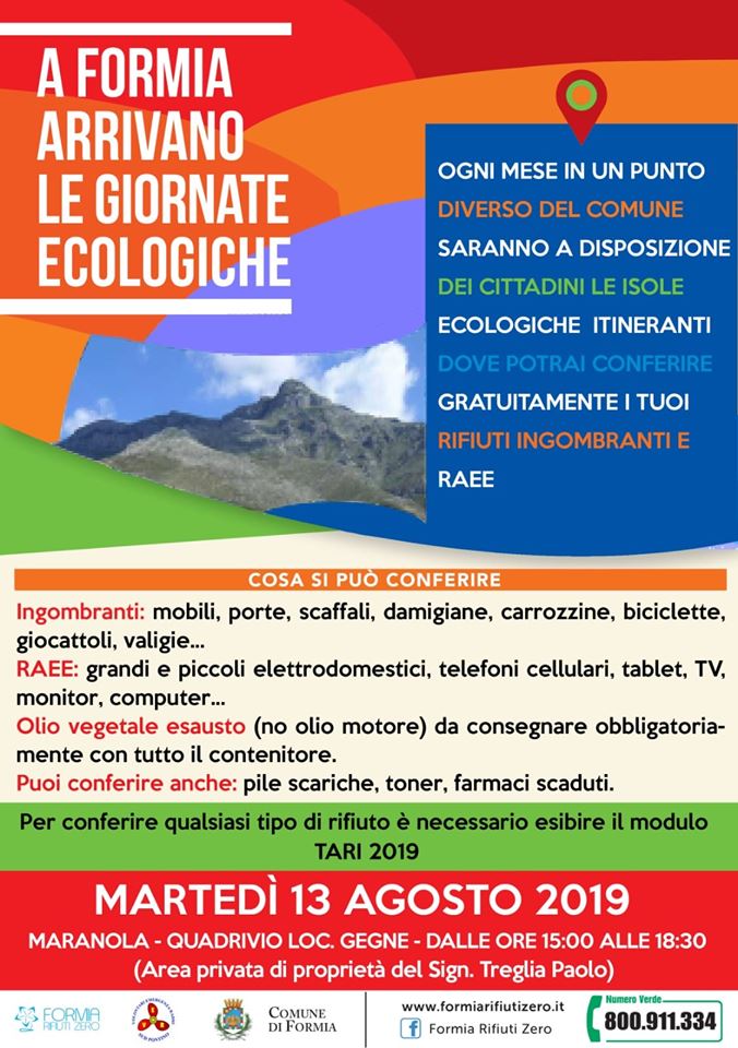 Si parte il 13 agosto prossimo dalle 15 alle 18.30 al Quadrivio di Maranola, dove sarà possibile conferire, presso l'isola ecologica itinerante, rifiuti ingombranti, oli esausti, pile e farmaci scaduti.