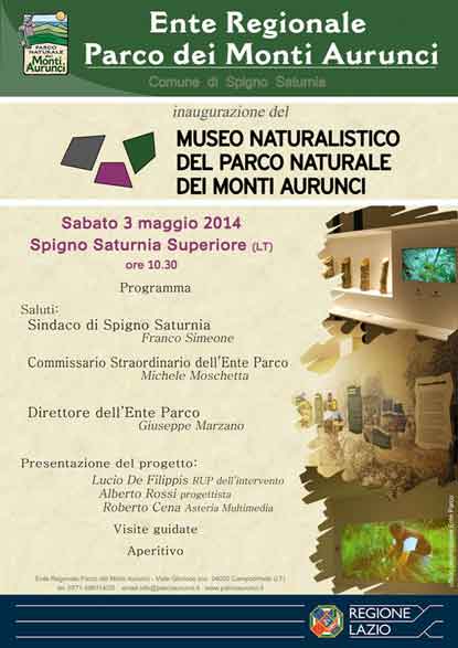 Sabato 3 maggio presso il comune di Spigno Saturnia Superiore (LT) alle ore 10.30 si terrà l'inaugurazione del Museo Naturalistico del Parco dei Monti Aurunci.